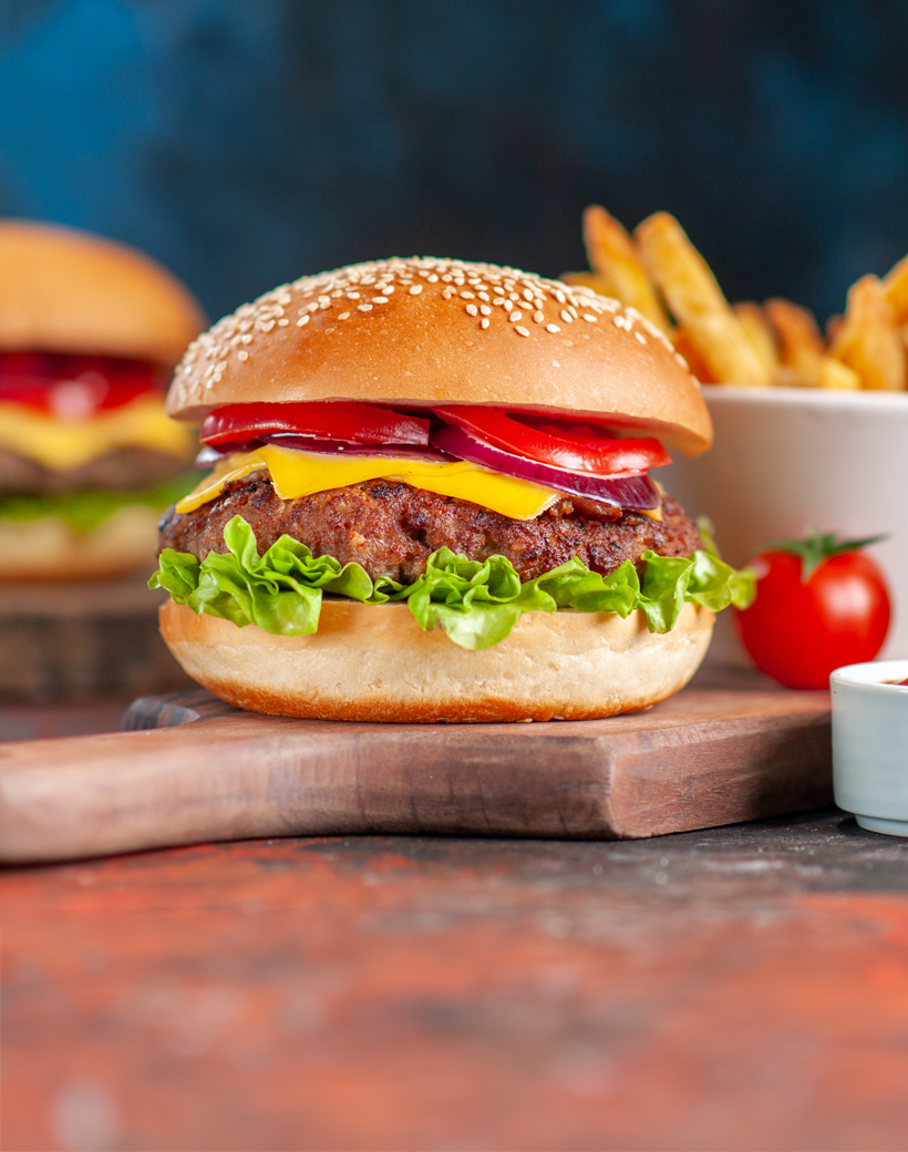 paradicsom, lilahagyma, dupla marha húspogácsa, cheddar sajt